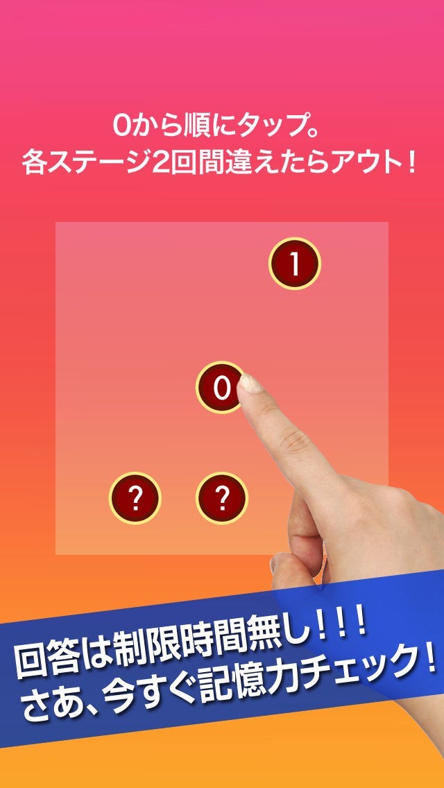 画面に表示される数字の場所を覚え、小さい数字から順番にタップしていくゲームです。数字が表示されるのはほんの一瞬です。あなたは瞬時に数字を記憶することができるでしょうか?