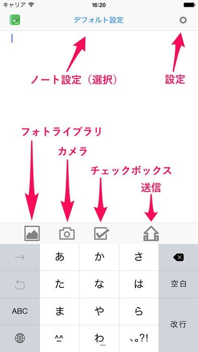 仕事用やメモ用、日記用など使いやすくノートを設定しておけば、自分が記入したいときに呼び出して、適切に入力できます。フォトライブラリから選択した画像や、カメラで撮影した画像をノートに付けることが可能なので、用途が広がります。
