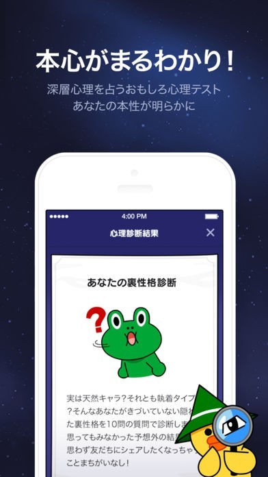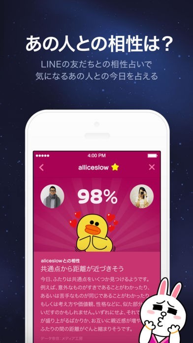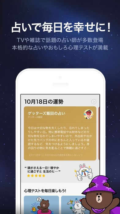 LINE占い - 2017年の恋愛・総合運が無料で毎日占えるとは、スマホ1台で運勢をいつでも気軽に確認出来るアプリです。困り事を相談する事で、不特定多数のユーザーと悩みを一緒に打ち明かしながら、有効的な解決策も共有出来る、話題のSNS方式システムです。日頃の運や好きな異性との相性も細かくチェック出来る、役立つ占いプログラムです。見るからに可愛らしいLINEキャラ逹が画面にいっぱい現れて来るので、運勢を癒されながら確かめかれます。恋やビジネス関係の悩み事まできちんと書き込めます。応援コメント欄が設けられている為、助けたい仲間を上手く励ませます。