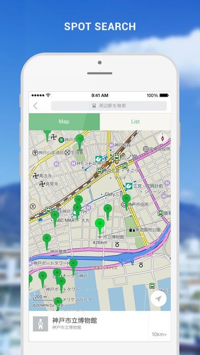 神戸観光に必要なスポットを簡単に探して目的地までナビゲーションします。