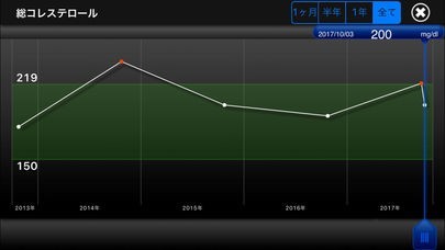 入力したデータは全てグラフで確認することができます。過去との変化率が一目で分かるようになりますし、検査の基準値を表示させれば、現在の自分の状態がどの程度なのかも簡単に把握できます。