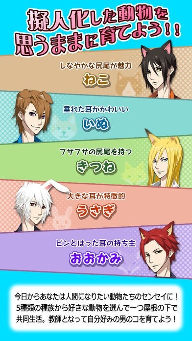 アプリ「擬人カレシ」では、動物から人間に姿の変わったキャラクターを選んでプレイヤーが育成することで、理想の「カレシ」との毎日の生活を楽しむことができます。キャラクターの服や髪型はプレイヤーが選んで着せ替えてあげることができるようになっていたり、どのように人間の世界を教えていくかによってキャラクターがどんな性格になるのかが変わっていったりと、まるで本当に不思議なペットを育てているかのようにキャラクターと触れ合うことが可能です。