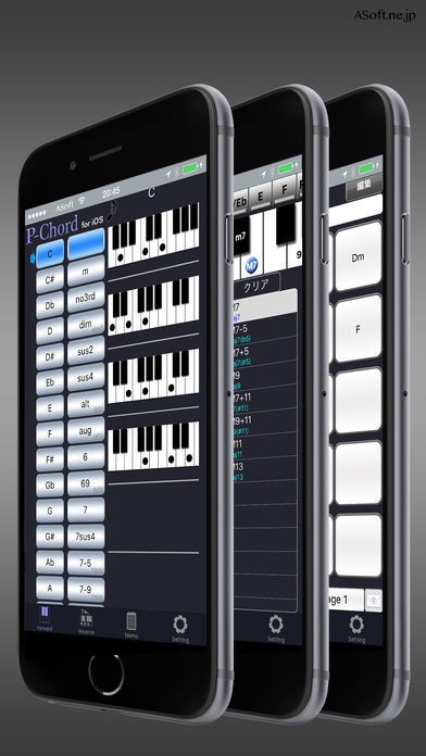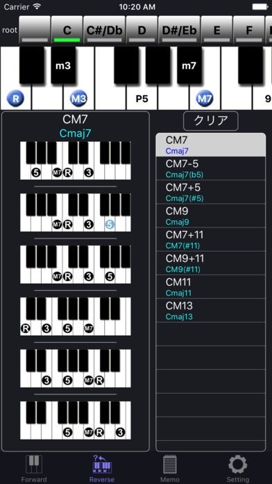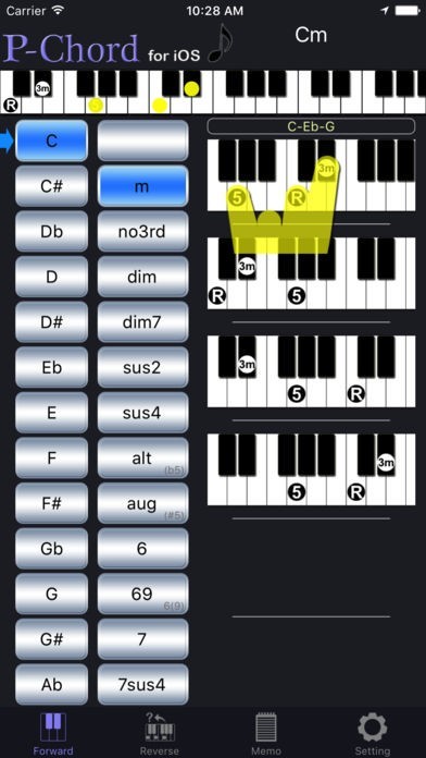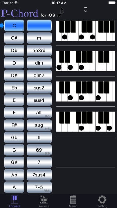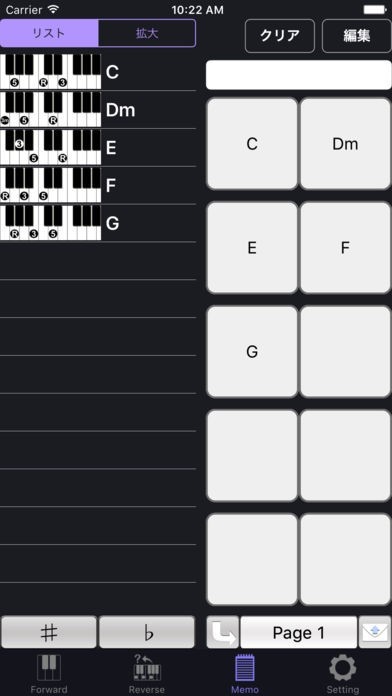 「P-Chord」では、ピアノのいろいろなコードを覚えることができるようになります。 「Forward」では一般的なものが表示されており、鍵盤の場所やどのような手の形で押さえればいいのかまで表示してくれるので、演奏することまでしっかりと考えた記憶ができます。 この機能は単語帳のように何度も確認して覚えることができるようになっているので、通勤、通学中などの時間を活用して学習することもできます。 また、「Reverse」では、さらに難易度の高いものをチェックすることが可能ですし、「Memo」では苦手なものだけを登録しておいて再確認したりすることもできます。 それ以外にも、「有料版」が用意されており、広告が消えたり、メモを40ページまで登録できたり、コードを参照してメールで送ったりというような機能が使えるようになり、さらに便利になります。