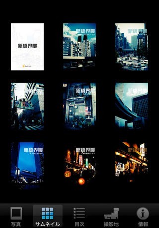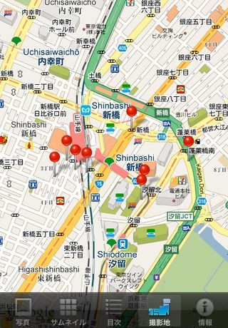 「新橋界隈」では新橋のいろいろな風景の画像が収録されています。サムネイルを利用すればたくさんの画像を一度にチェックしたりもできます。 アプリはすべて無料なので気楽にアプリを見てたのしめます。 そして、このアプリの特徴としては写真集のように画像を眺めるのではなくて、撮影した場所を地図上の赤いピンで表示してくれるので、気に入った画像を発見できれば撮影場所まで足を運んで自分もその場所でおなじような写真を撮影できます。 このように聖地巡礼のような楽しみ方を提供してくれます。 他には情報によって変更点や重要な情報があればすぐに知ることが可能です。 あた、目次を見ればアプリ内のすべての情報を一瞬で把握することが出来るようになっています。