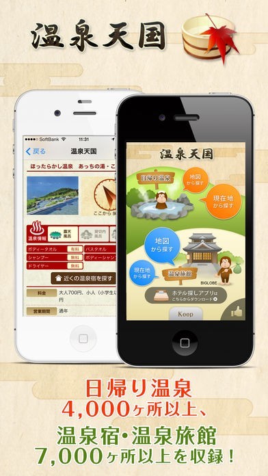 土地感のない地域に出張で出かけた時に温泉に入りたいと思った時やドライブの途中で暑かったり遊んでかいた汗を流したいと思って近くにある温泉の場所を探したり温泉宿はあるけれど日帰り入浴ができるのかを確認したい時に便利な『温泉天国 日帰り温泉と温泉宿』は現在居る場所から近くにある温泉施設の中から28種類の条件で好みに合った温泉を探すことができるアプリです。ただ温泉を探すだけではなく7000件以上収録されている温泉のある宿泊施設の中から厳選されたサイトの宿泊プランを比較することもできるのでお得に温泉旅行を楽しむことができます。全国の温泉が収録されているので週末に出かける予定を立てたり連休に合わせて遠くにある温泉を探して旅行に行ってみるというのはいかがでしょうか。