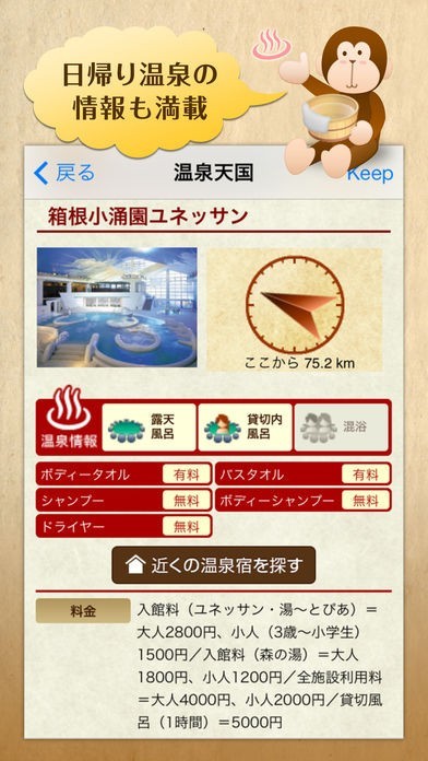 「温泉天国」は日本各地にある温泉の情報を集めたアプリです。アプリには4000ヵ所以上の日帰り温泉と、7000ヵ所以上の温泉宿や温泉旅館のデータが記録されており、温泉の場所を地図から確認することができます。露天風呂や源泉かけ流し、食事ありといった条件で検索結果を限定すれば、希望の条件を満たす施設だけをピンポイントにチェックでき無駄がありません。場所以外にも定休日や営業時間など、見つけた温泉の詳細はアプリから調べることが可能で、各旅行サイトごとの宿泊プランの比較も行えます。