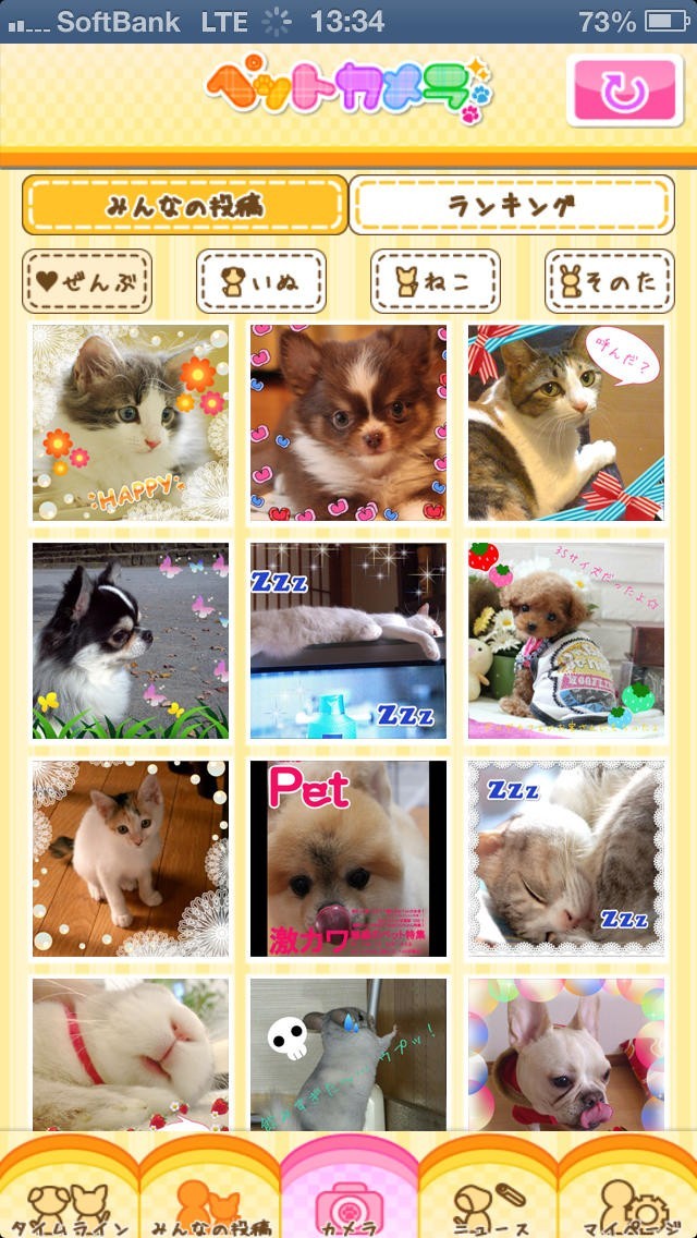 このアプリではペットの写真をフィルタやスタンプなどを利用することによってさらにかわいく見せることができます。 そのような写真をたくさん見ることが出来るので、加工の参考にすることができますし特に気に入ったものには「かわいいね!」ボタン!を押して応援してあげることも出来ます。 加えてフォローすることによって新作などが出た場合には逃すこと無くチェックできるので、見逃してしまったりというようなことは無くなります。 他にもランキングからかわいいものを探すといった方法も用意されています。