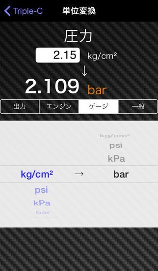 インチをミリに、バーを平方センチメートルあたりのキログラムに、排気量単位CC(分あたり)をLB(時間あたり)に変換したりできるので、外車のスペックを日本仕様に変換しながらチューニングパーツの準備やテストの補助として重宝します。
