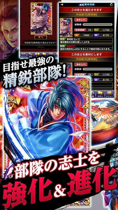 キャラクターの総数は100人を超えています。歳三に龍馬、徳川の将軍など、組み合わせはあなたの自由です。コツコツと育成強化して最強ユニットを作り歴史を変えましょう。