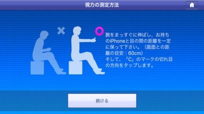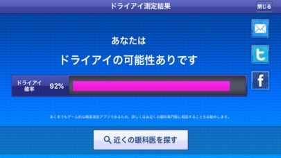 「DryeyeKT」では、わずか1分でドライアイかどうかを診断することができます。 よって、ターゲットは事務の仕事をしていて目を酷使しているような方があてはまります。 測定方法は腕をまっすぐに伸ばし、一定の距離で切れ目の部分をタップするだけなので、とても簡単です。 完了したら、「あなたはドライアイの可能性有りです」などという表示とパーセントで示してくれるので、どのくらい危うい状態であるのかを把握しやすいです。 もし、問題があったのならば、「近くの眼科医を探す」ボタンをタップすることで病院へ行く具体的な計画を立てるきっかけにすることができます。 ほかにも、メール、ツイッター、フェイスブックで共有することができるので、他の方にも気をつけて欲しいというメッセージを示すことができます。