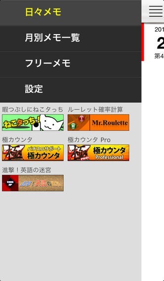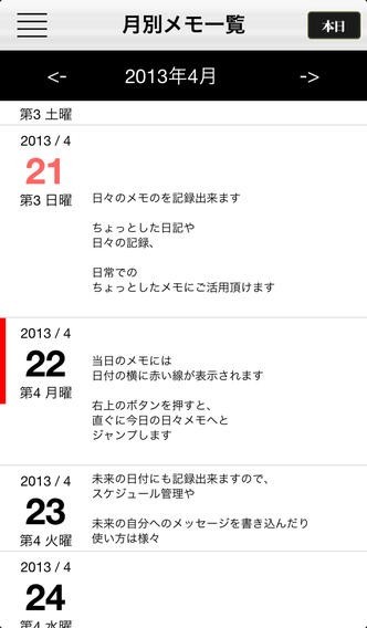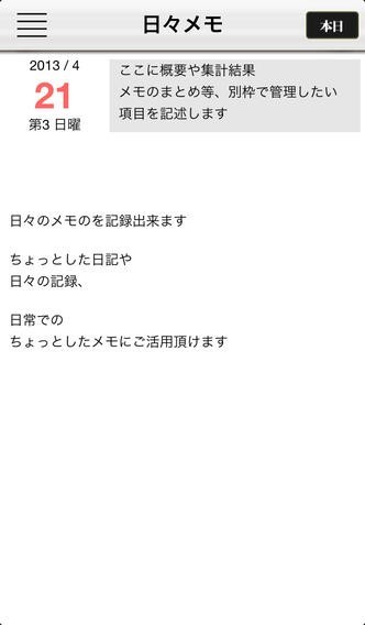 日々のちょっとした事をメモでき、忘れない為のメモはもちろん、一言日記としても使用できます。すぐ起動して即記入。シンプルで無駄な機能を一切省き、すっきりとまとめる事ができます。月別の表示で、いつ何があったかの確認もスムーズに行えます。メモの種類も、カレンダーに書き込んでいくようなスタイルのものと、白紙に書いていく一般的なメモの様式を選べるので、使い分けも自由自在です。カレンダー式は決まっている予定をわかりやすく整理でき、一般的なメモ様式はすぐにメモを取りたい時に便利です。