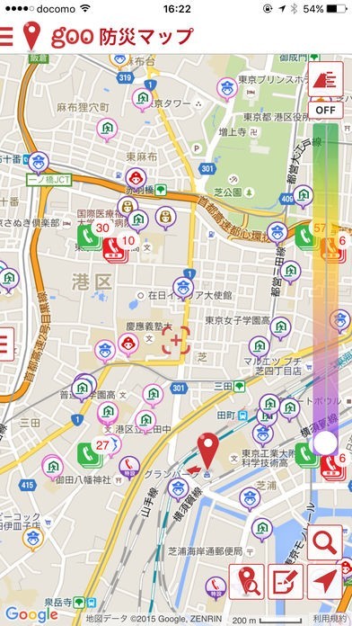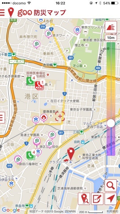 地図上に医療機関や、避難所などを表示しているので、災害時などいざという時に便利です。またNTTが提供している公衆電話の位置データも記載されているので役立ちます。