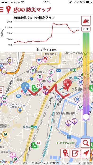 goo防災マップで避難場所までナビゲーションしてもらうことが可能