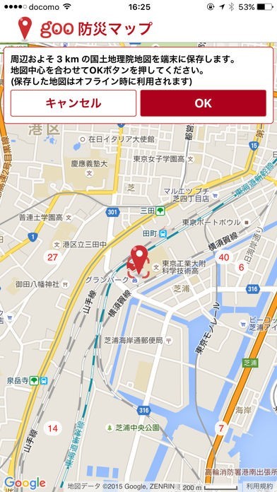 地図の中心周辺から約3キロは事前に端末に保存が可能