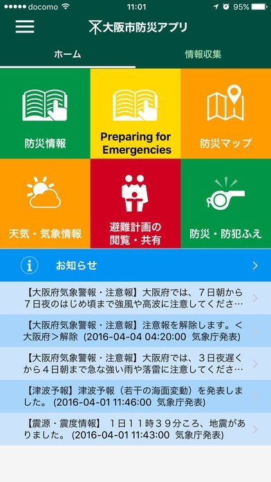 大阪市の防災情報をスマートフォンでチェックすることができるアプリとなっていて、大阪市を含むエリアで災害が発生した場合にはメールでお知らせをしてくれるようになっています。