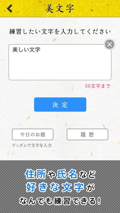 「美文字」は美しい字を書くための練習ができるアプリです。単語や文字を入力するだけで、字のお手本を表示します。書体は3つから選べますし、平仮名や片仮名にも対応。住所や季節の挨拶など、50文字以内ならば好きな文章を学べます。一文字ずつ拡大できるため、とめやはらいなど詳細を確認しながらなぞれます。一度入力した文字は履歴からよびだして復習が可能。ランダムでお題を表示したり、お手本を消してそのまま書いたり、効率よく学習できます。