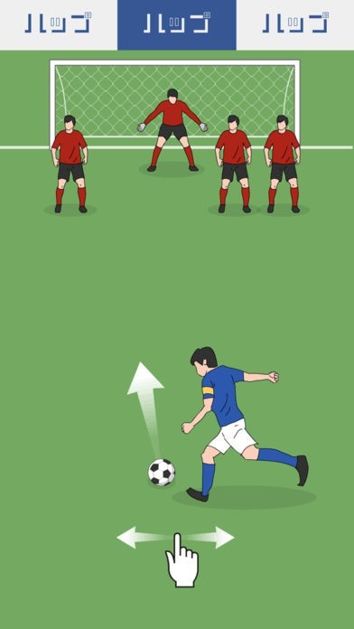 ゴール前に並ぶ相手選手の間を狙い、ボールを蹴る操作をします。隙間に合わせ右や左に定めたり、蹴る瞬間を決めたりとゴールするために相手キャラの隙を見つけ出し有利にできます。