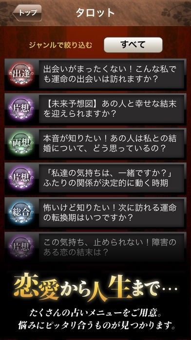 このアプリを使うことで、バラートクラーラさんのタロット占いと数秘術占いを合わせた信頼できるものを中にh無料でも見ることができ、「幸せの開運メッセージ」をもらえるので、占いを信用していて、それを守ろうと努力することができる方がターゲットになります。 それ以外には、毎日「今日の運勢」をチェックできるので、それを見ることを新聞をチェックするように日課にすれば、気をつけなければならないことを把握しておけて、危機から身を守ってくれる場合もあるでしょう。 さらにはタロット占いをしてもらえるので、ピンポイントで今悩んでいることや気になっていることを対面しているグラフィクによって知ることができるので、まるで近くに占い師さんがいる気分を味わえるので、より信頼することができるでしょう。 さいごに有料でより本格的な占いを70以上あるメニューの中から選択できるので、どうしても気になるものがあったなら試してみるのもいいでしょう。