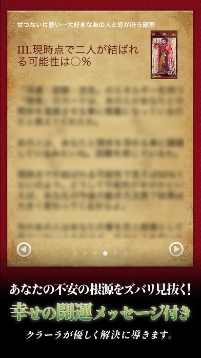 アプリ「予言者バラートクラーラのタロット占い・数秘術占い」では、日本のみならず各国でその実績が認められている「バラートクラーラ」のタロットと数秘術による予言を、スマートフォンから手軽に知ることができます。霊視とタロット占い、数秘術による鑑定を組み合わせた彼女の予言は、今までにさまざまな未来を的中させ話題になっています。ただ毎日の運勢をチェックできるだけではなく、鑑定画面では高精細なグラフィックが駆使されているので、クラーラに対面して直接鑑定してもらっているような感覚を味わうこともできます。解決したい悩みがあるときには、カテゴリー別の予言を受けることも可能です。