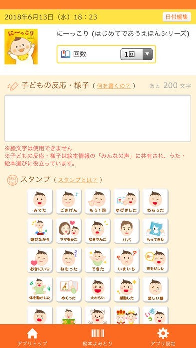 「わらった」「ゆびさした」「なきやんだ」など子どもの反応をスタンプで登録