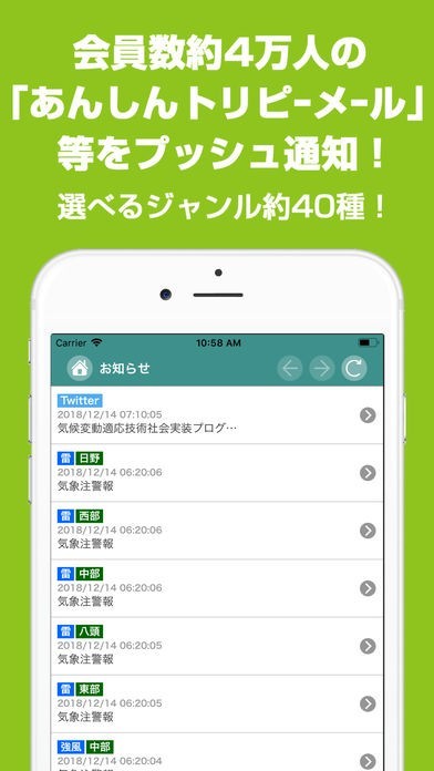 ◆通知機能で「お知らせ」する「あんしんトリピーメール」のエリアやジャンルの選択は、本アプリの「設定」画面のみで行うことができ、「あんしんトリピーメール」本文末尾に記載されている「変更」等のリンク先からは設定できません。