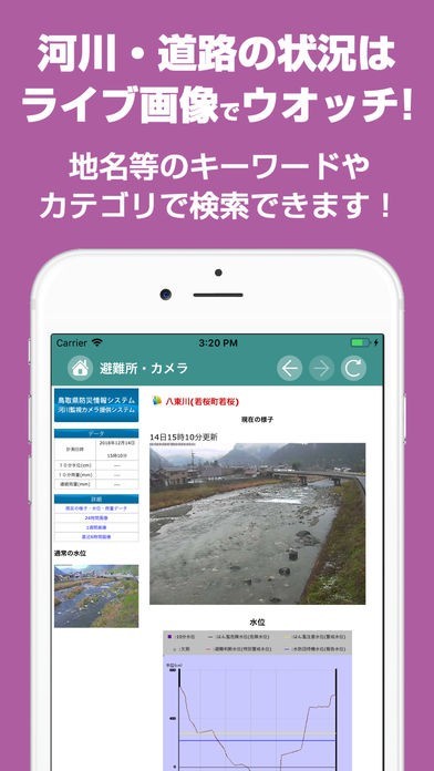 鳥取県内の最寄りの指定避難所・指定緊急避難場所、防災ライブカメラ(道路・河川)の一覧や説明、各箇所の位置図(自動経路案内)、ライブカメラの実況画像が閲覧できます。