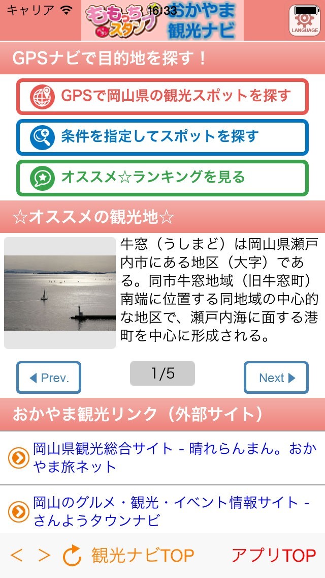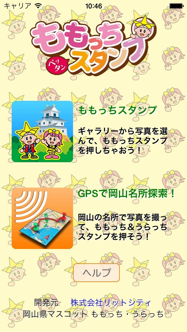 「ももっちスタンプ」は岡山県マスコットキャラである「ももっち」と写真を撮れるだけでなく、岡山を観光に行く際にはオススメの旅行アプリです。 機能は2種類あり、1つめの機能は撮った写真やアルバムの写真に、岡山県のマスコットである大人気キャラクター「ももっち」や「うらっち」のスタンプを押せる機能です。 スタンプを押した写真は簡単に保存できるので、SNS等にアップする事も可能です。 2つめの機能は岡山の観光名所を探索出来る機能です。 GPSで観光名所を探せるだけでなく、条件指定やオススメランキング等、岡山県に行く際には重宝する情報が詰まっています。