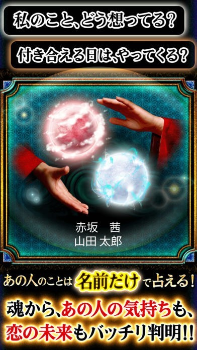 秘儀占いは、恋愛から転職まで神の力の鑑定を楽しめます。気になる人との未来を知りたいときは、漢字で名前を入れると二人の気持ちがわかります。名前だけでできるので気軽に占えます。