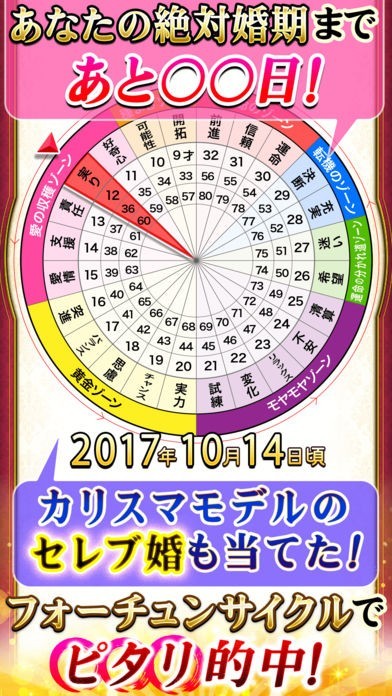 このアプリでは、占い師イヴルルド遙華の独特の占いであるフォーチュンサークル占いを体験できます。フォーチュンサークルとは24年のサークルでいまどのサークルにいるかを知ることができます。