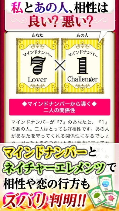このアプリでは、主に「恋愛」や「結婚」に関する運勢を、イヴルルド遙華独自の「フォーチュンサイクル占い」により、細かく鑑定することが出来るのが特徴となっています。
