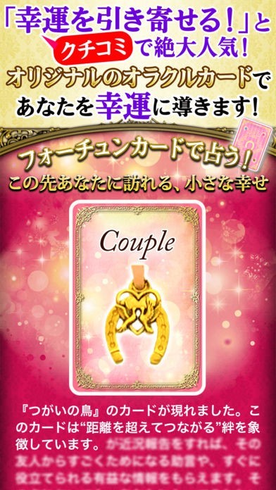 このアプリは、自分のフォーチュンサークルだけでなく、いま一番あなたが輝ける場所や、転職・天職に関すること、あなたにパワーをくれる人物などさまざまなアドバイスも受けることができます。