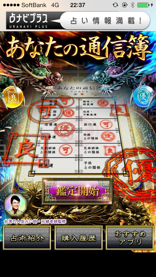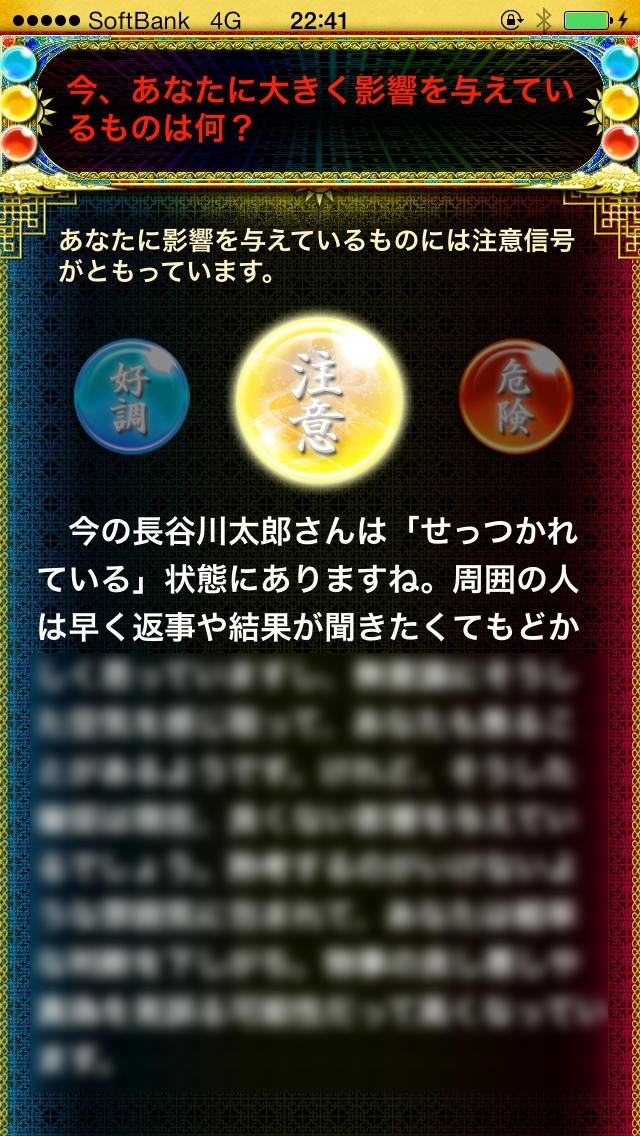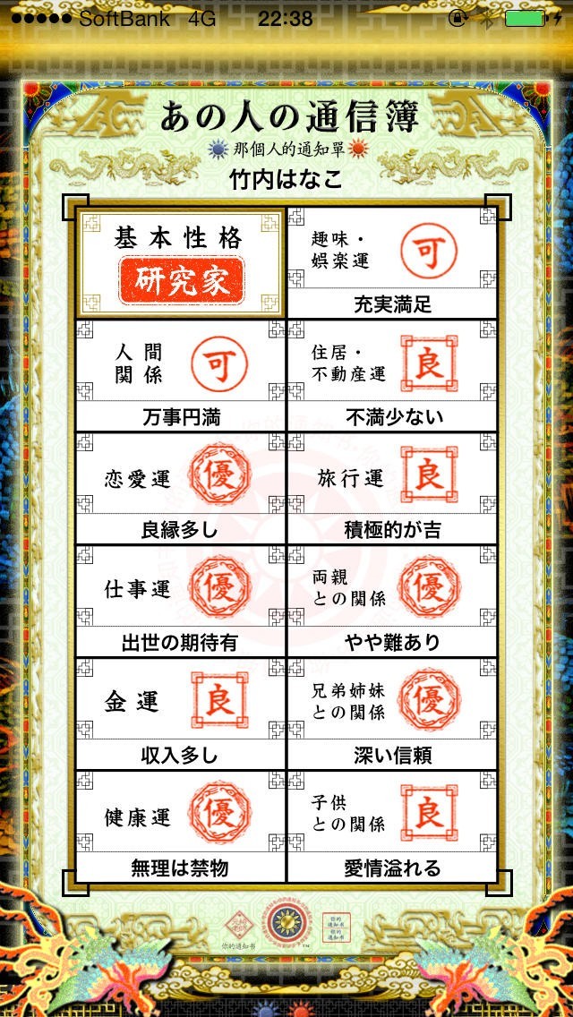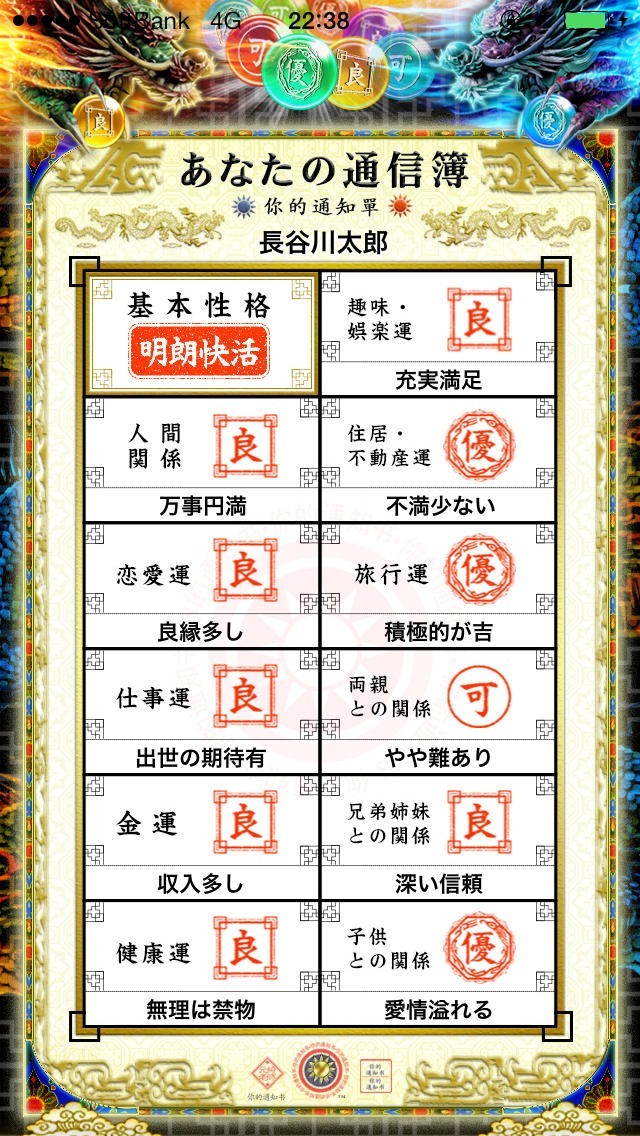 「あなたの通信簿」は鑑定結果が通信簿という形で表示される占いアプリです。 研究家や明朗快活などの基本性格の他、人間関係や恋愛運、金運、仕事運、旅行運、健康運など様々な運勢が分かります。 好調、注意、危険といった大きな影響を与えているものも鑑定結果に出てきます。 注意や危険は特に気を付けたいところです。 有料鑑定メニューも用意しており、恋愛や結婚や仕事など悩みに合った鑑定も受けられます。 台湾の元綺老師による鑑定がスマホでいつでも分かるのが良いところです。