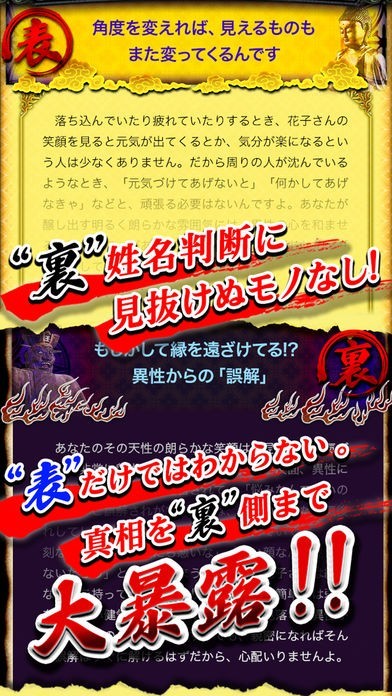 通常の占いアプリでは「総格」や「天格」などを占うのが一般的ですが、このアプリは裏占い鑑定も搭載しています!裏と表の両方から悩みを解決してしまう今までにはない運勢鑑定