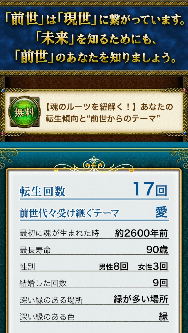 ※有料にて購入された鑑定メニューは、トップ画面右下の「購入履歴」から何度でも閲覧することができます。ただし、端末を移行された場合は履歴情報が引き継がれませんので、画面キャプチャ等で保存することをおすすめいたします。