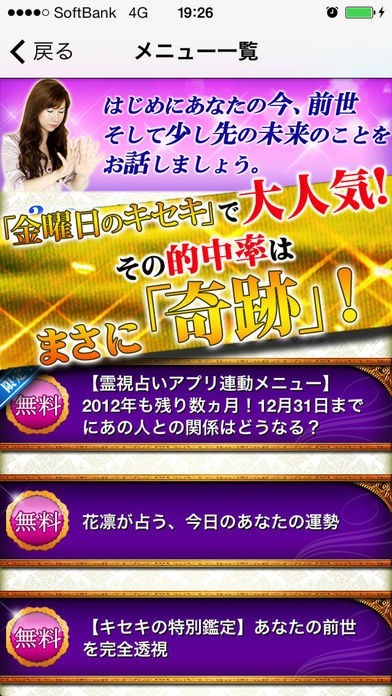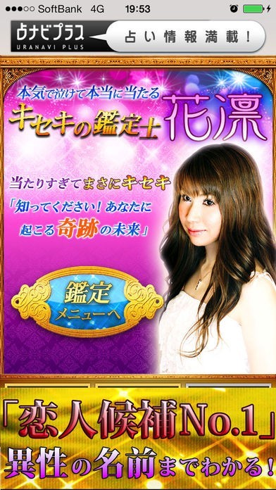 アプリを使ったことのない初心者の方には、有料鑑定前に、まず「無料鑑定メニュー」で診断してもらうことが出来ます。内容を見て、その後、有料鑑定メニューに移るかの判断が出来ます。