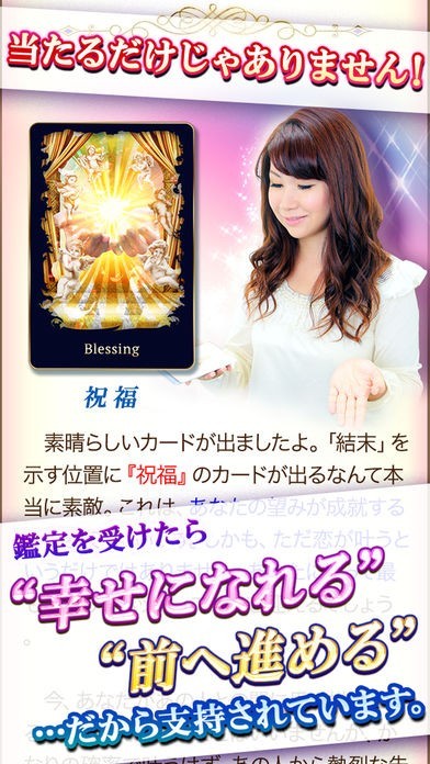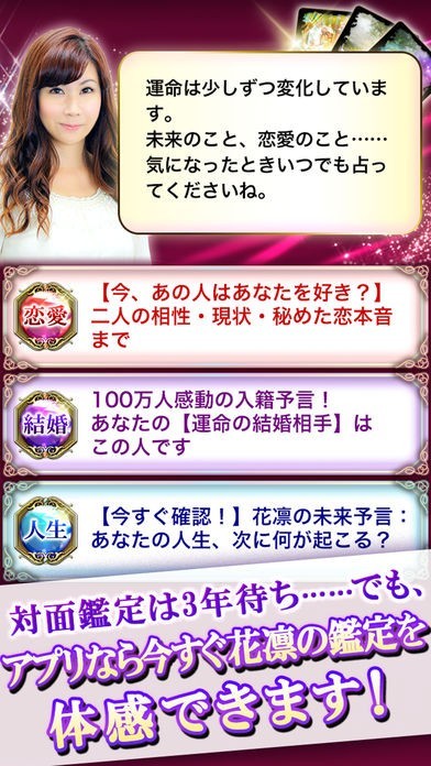 「超的中に100万人涙!花凛のタロット占い」は、超人気占い師である花凛のタロット占いがスマホで手軽に体験できる、便利な占いアプリです!気になる人との運勢から自分の未来予想まで、幅広く占う事が可能です!