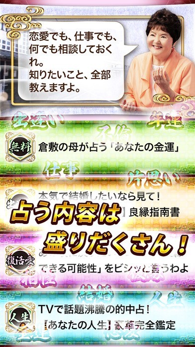 時には厳しい言葉も言うけれど、ずばり当たって、心があたたかくなる「倉敷の母」ならではの鑑定をお楽しみください。