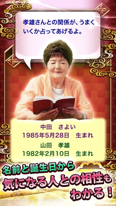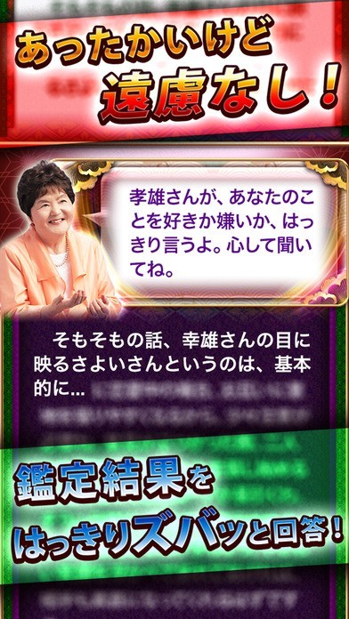 あなたの名前と誕生日から「倉敷の母」が、選んだテーマにあわせて鑑定。語りかけるように結果を届けます。