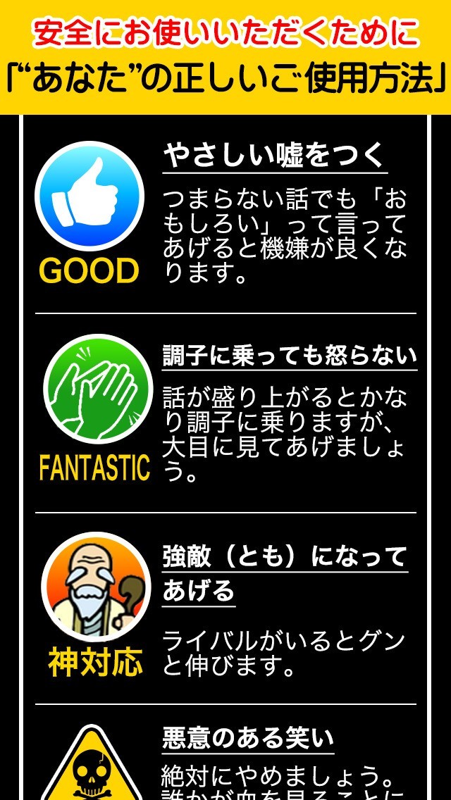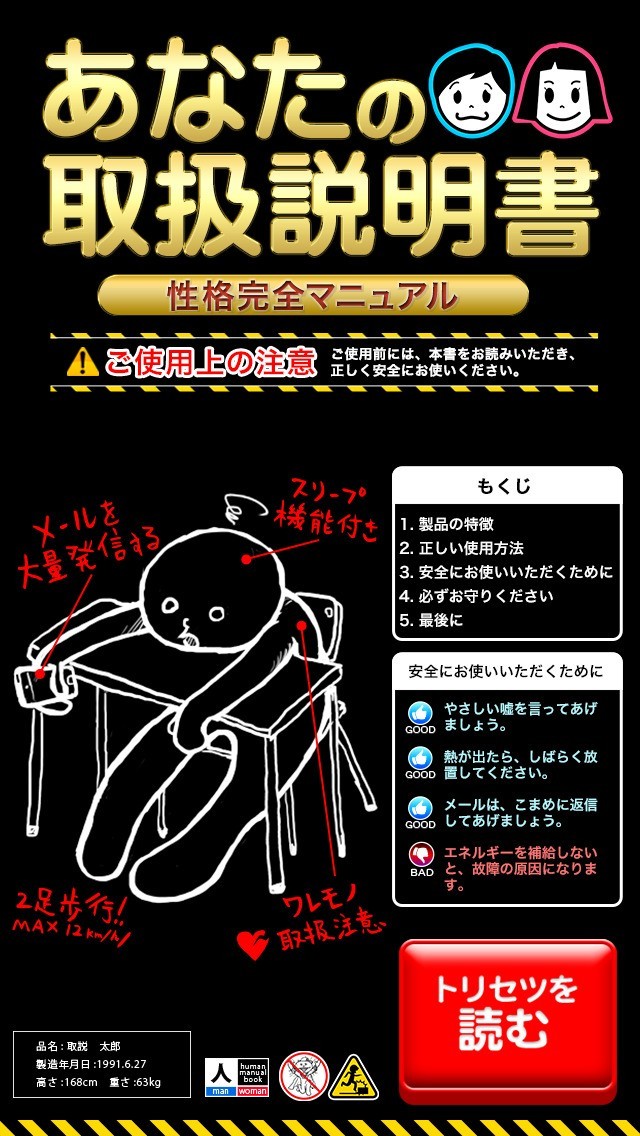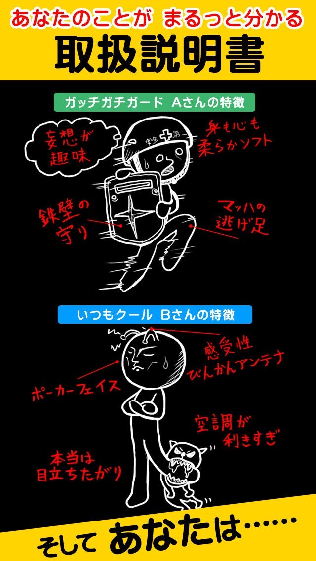 中々気が付かない自分の性格診断を受けたいという時に便利なのがこのアプリです。 性格上のご注意、正しい使用方法などの取扱説明書をアプリで閲覧する事が可能です。 ちょっと変だと感じた時には症状や対処法なども分かるために便利です。 身近に気になる人が居るけど、どうやったら仲良くなれるのか分からないといった時にも役立ちます。 電化製品の取扱説明書のように解説しているため、お友だちに見せて話題にしたい時にも使えます。 取扱説明書を閲覧した後は日常生活を送る時の判断に利用できるようになります。