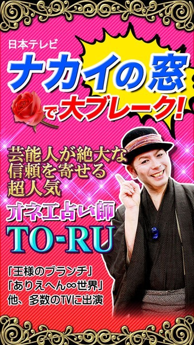 これは、民放の人気ゴールデン番組に多数出演した経験を持つ、オネエ占い師TO-RUによる占いアプリです。オネエだからこそ、男も女も全てお見通し。あらゆる悩みをTO-RUが一刀両断します。