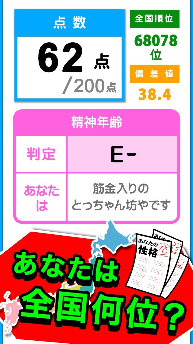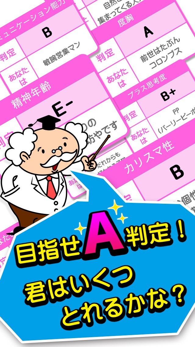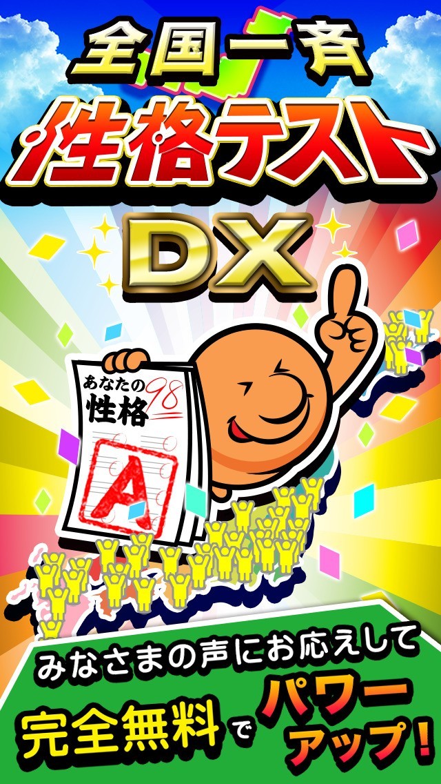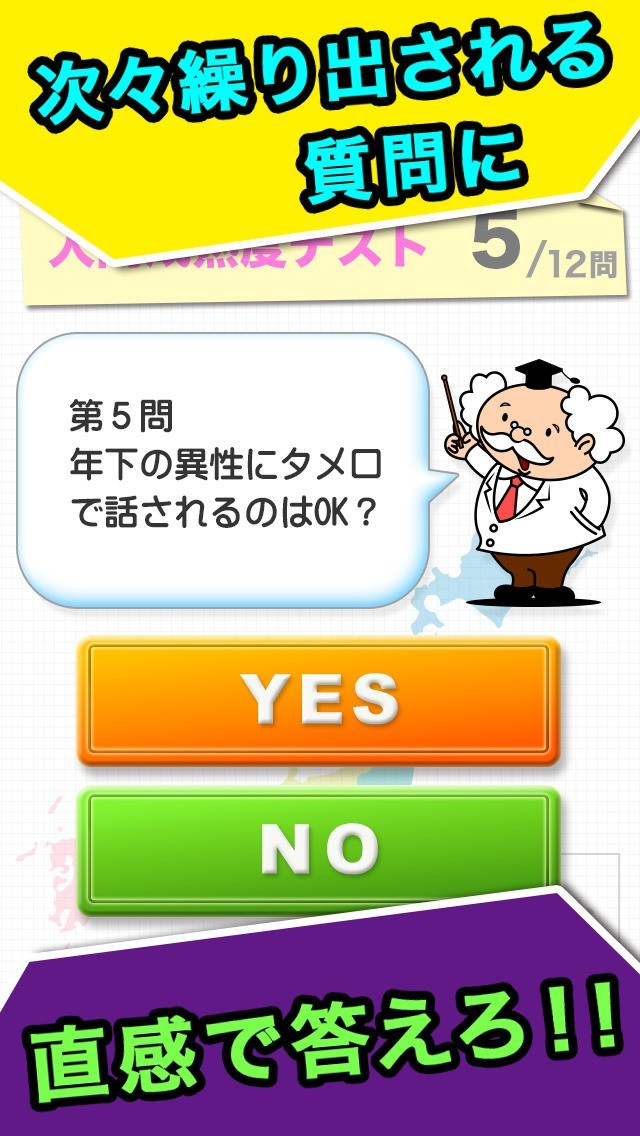 姓名判断も診断テストも同時に楽しめる「全国一斉性格テストDX」 自分の名前を入力したら、次々と繰り出されるきわどい質問に直感で答えていきましょう。 用意された質問は全50問。YESかNOの2択を選ぶだけと、簡単操作も嬉しいポイントです。 コミュニケーション能力や度胸、精神年齢などを診断結果として表示できる他、全国順位や偏差値も教えてくれます。 飲み会や合コンの席で皆でワイワイ診断しつつ、順位と偏差値を競ってみてはいかがでしょうか。