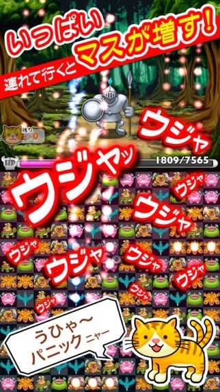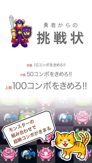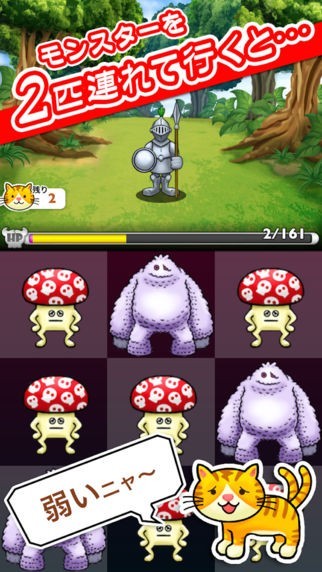 App Storeより引用ネコと魔王のモンスター大作戦は、モンスターを3匹揃えて敵を倒していくバトル型のパズルです。