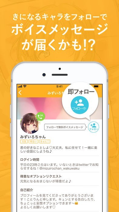 気になるキャラクターをフォローしたら、相手からあなたへ向けた特別なボイスメッセージが届くかもしれません。そして通話で進密度を上げていくとお願いごとだってきいてもらえるかもしれません。