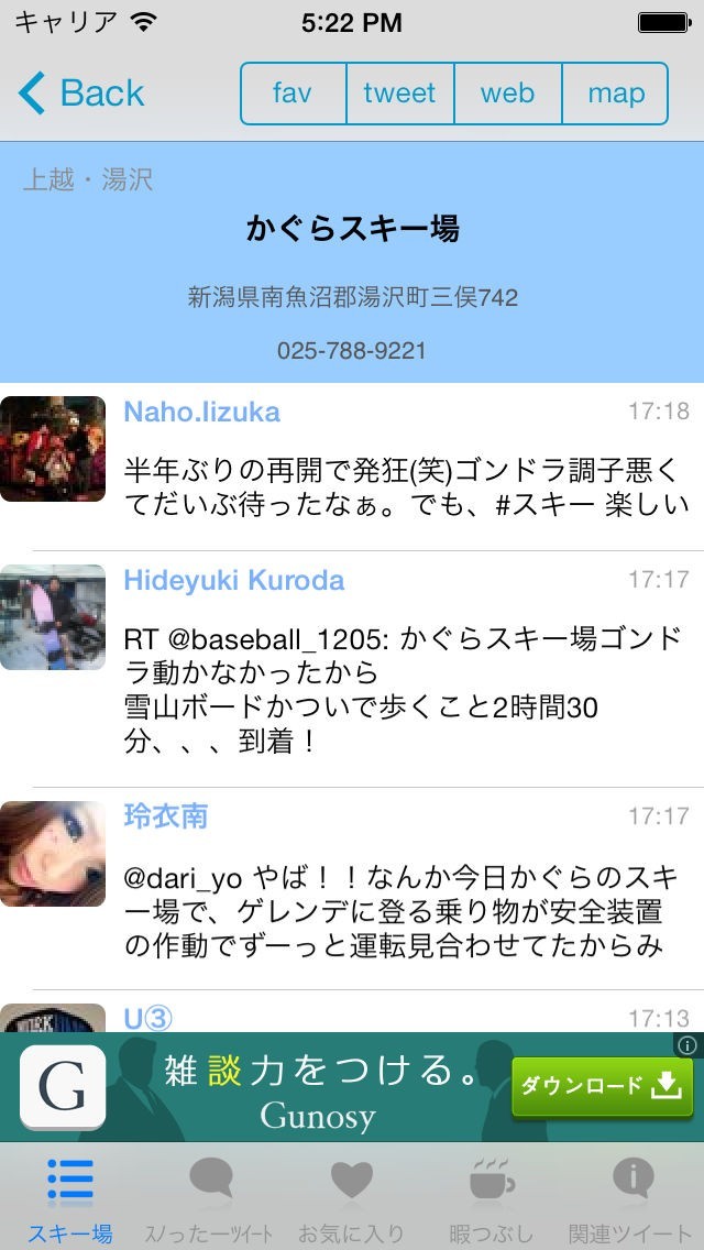 ・100以上のスキー場関連のツイートを一覧表示