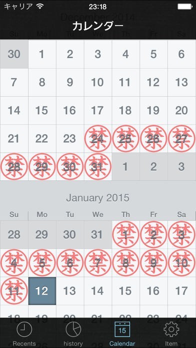 カレンダー機能では我慢できた日にスタンプが押されどれだけ継続できたかが一目で確認できます。カレンダーをスタンプで埋め尽くせるようがんばりましょう。履歴閲覧機能からは過去にどれだけ禁欲できたかを確認でき、生活改善に役立てることが出来ます。