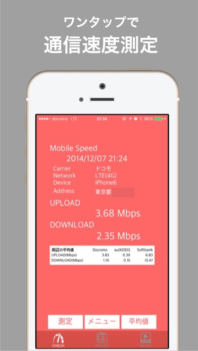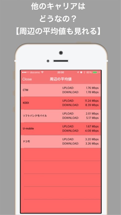App Storeより引用アプリ起動・ワンタップで今いる場所の通信速度を計測します。周辺の平均値(キャリア毎)も表示するので、キャリア変更の参考とすることができます。