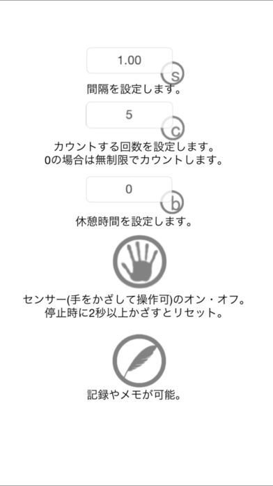 メトロタイマーは、好みの間隔でカウントしていくタイマーです。使い方は、間隔と回数、休憩時間を決めます。回数は0にしておくと無限として設定されます。間隔や回数は、自由に設定できます。メトロノームみたいに少しずつ間隔を短くすることができるので、運動したり体を鍛えるときに使えます。メモ機能があります。停止後は、羽の絵のメモボタンをワンクリックすると、結果をメモすることができます。月日と時間、間隔、回数は自動的に記録されるので、便利です。メモは自分好みに編集可能で、記録を残したいときに役立てることができます。リセットするときに手をかざしてセンサーで操作すると、忙しいときに手間が減ります。