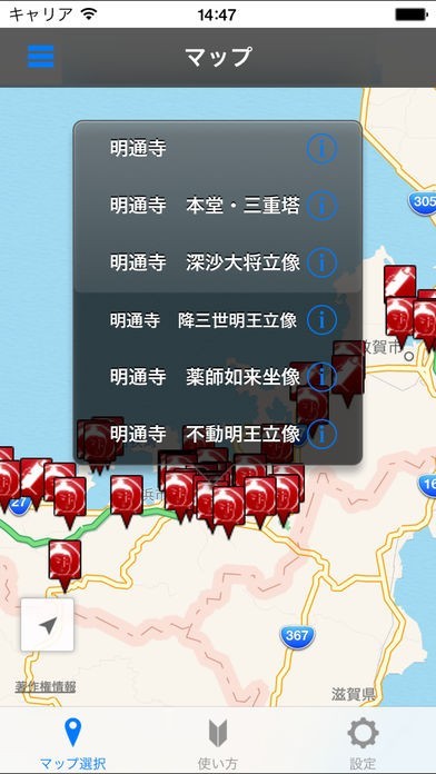 App Storeより引用「若狭路の神ほとけ」は福井県敦賀市や小浜市など嶺南地方の6つの市町に点在する神社仏閣の情報を手軽かつ楽しく得られることができるアプリケーションです。ご自分の現在地を取得し、現代地図や古絵図を見ながら神社仏閣を探索できます。主要ポイントでは写真や文章による詳細情報を表示することができます。若狭路を散策しながら、歴史と伝統あふれる仏像や神社を堪能してみませんか?