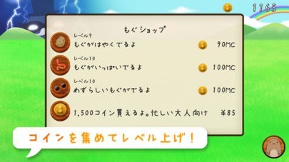 モグラをタップして引っこ抜くだけのシンプルなヒマつぶしゲームで、引っこ抜いて出てきたコインを貯めてショップでゲームを有利に進められるアイテムを購入することができます。アイテムを使って、より沢山のモグラを集めてユーザーレベルを上げていきましょう。