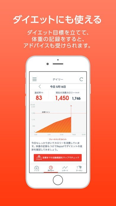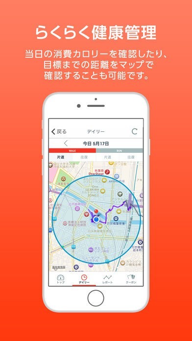一日当たりの目標歩数を設定することができるようになっていて、目標まであとどのくらい歩けばいいのかをマップで表示することができるので、目標までどのくらいかをわかりやすくすることが可能です。
